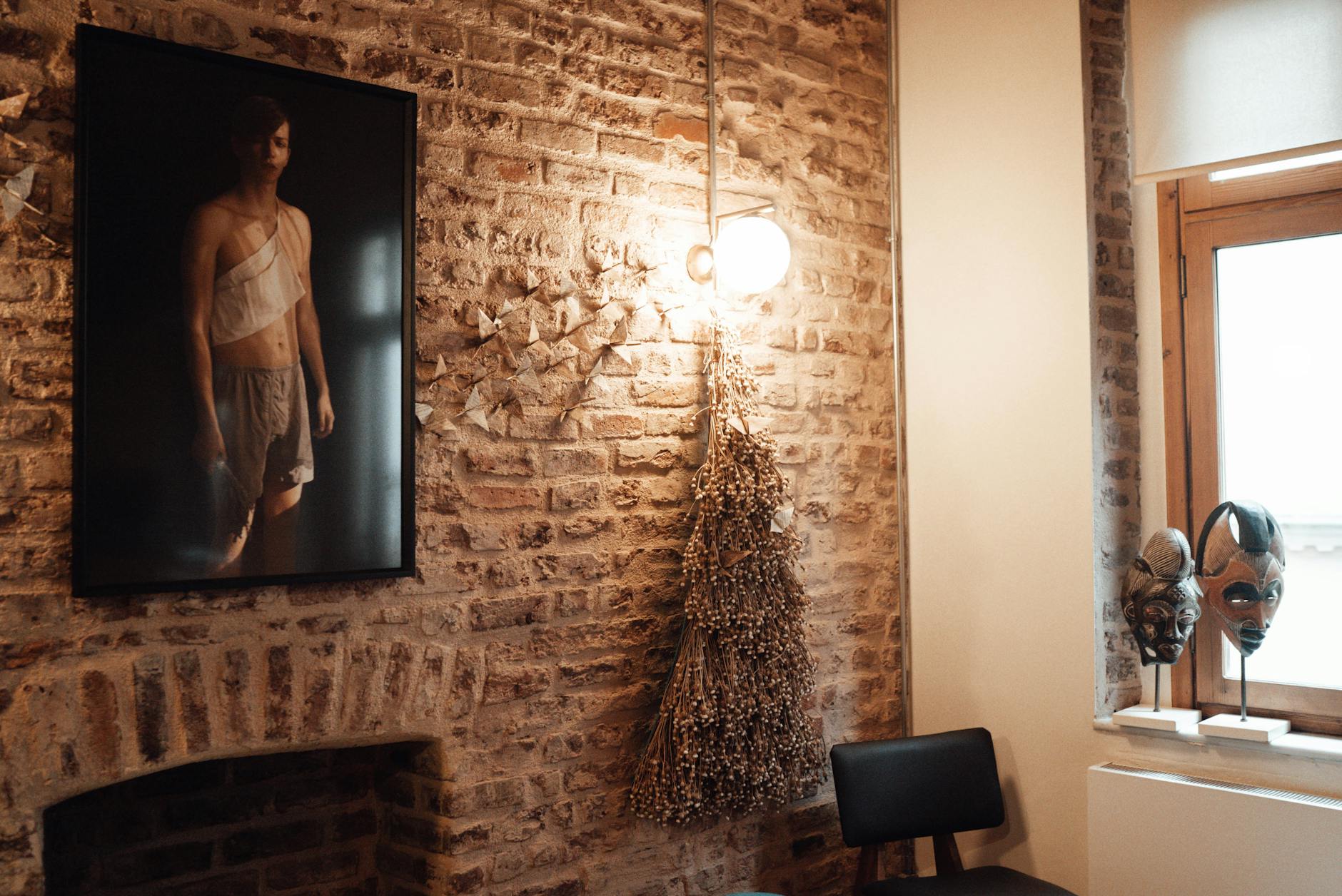 • Powtarzalność – ten sam odcień stali na kominku, listwach, lampach; ta sama cegła na fragmencie ściany i w kuchni.